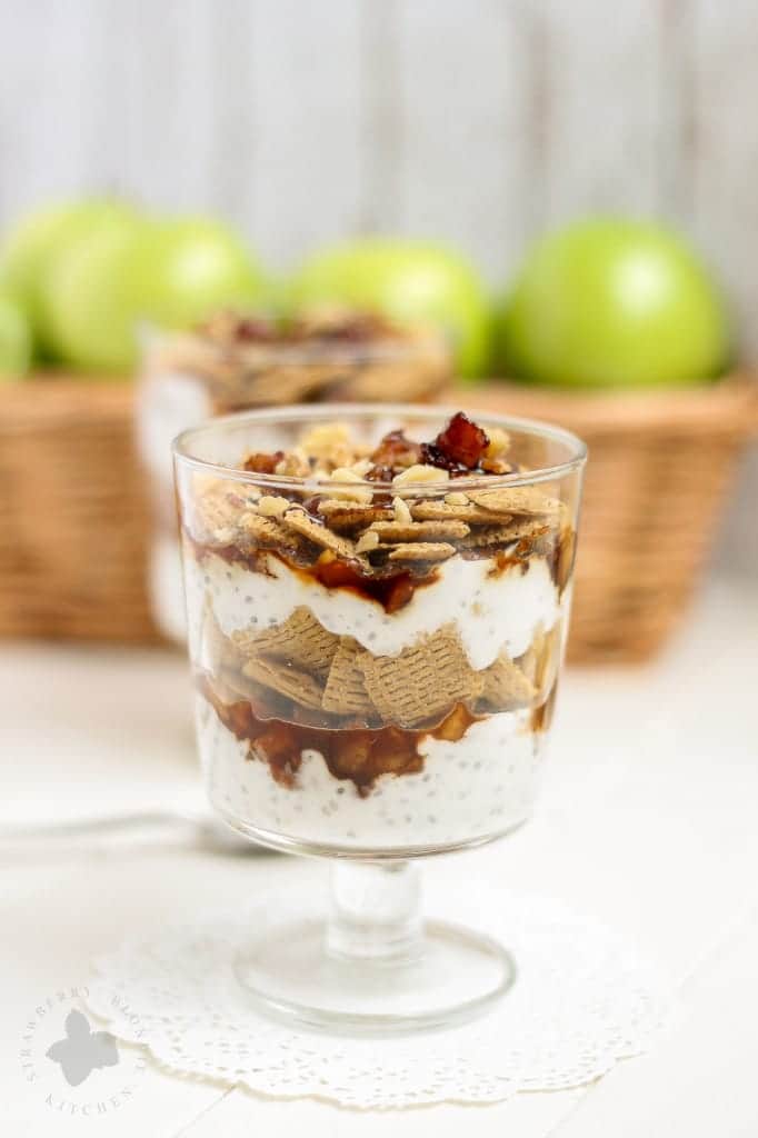 I recommend you assemble the parfaits just before serving. The reason being, if you pre-make the parfaits the night before, the cereal in the center will become soggy.You can make the apples ahead of time and store in refrigerator until ready to use.