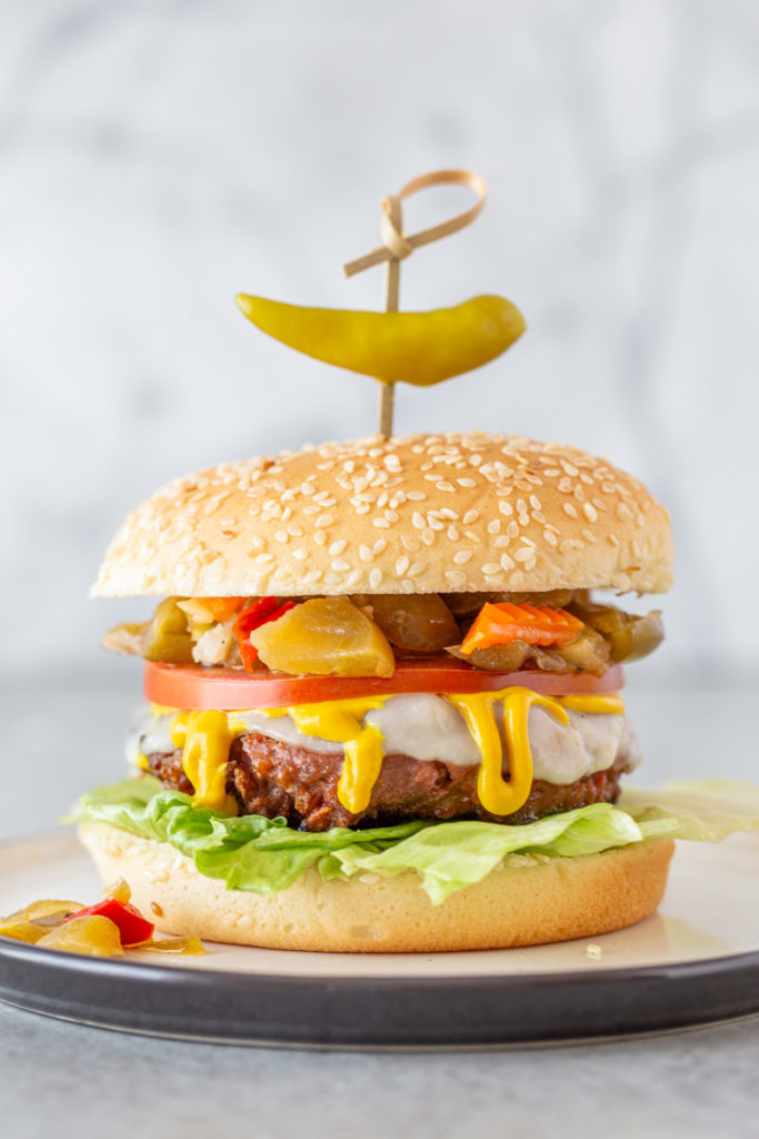 These Chicago-Style Beyond Burgers are a plant-based patty piled high with provolone cheese, mustard, lettuce, tomato and giardiniera all on a seeded bun!