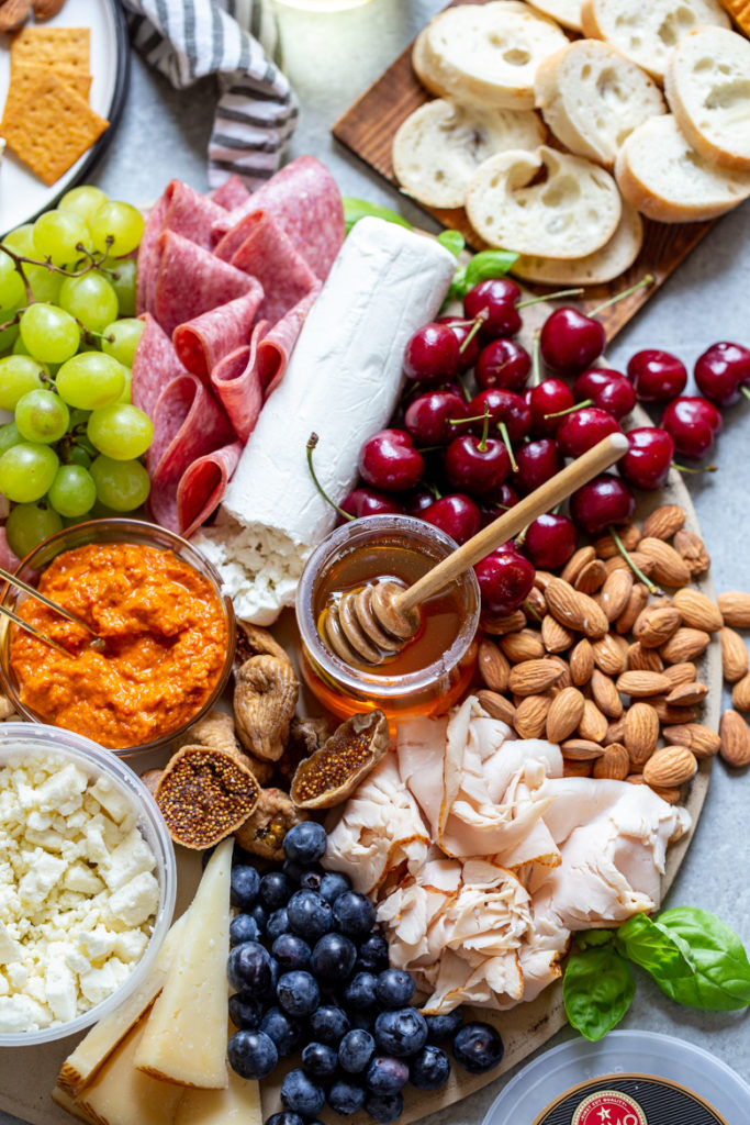 I love to pair prosciutto with peaches and honey, feta cheese with roasted red pepper spread and goat cheese with salami.