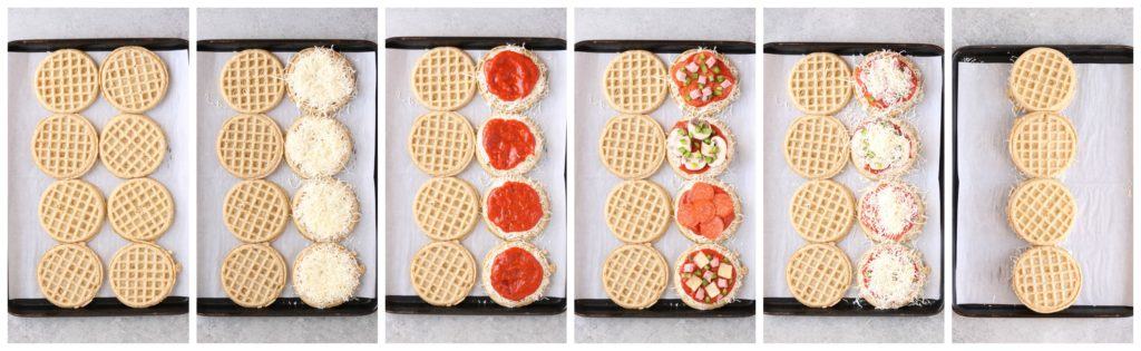 Spread 2 tablespoons pizza sauce onto 5 waffles.