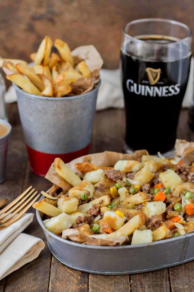 Crispy fries piled high with beef and mixed vegetables, smothered in Guinness gravy and topped with cheese curds make for one awesome Shepherd’s Pie Poutine.
